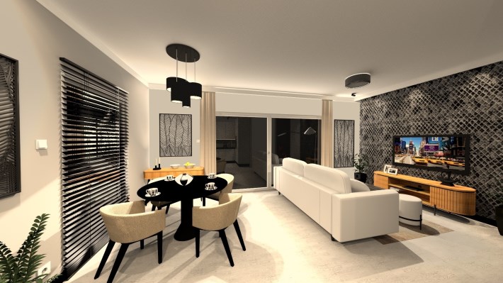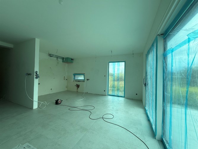 salon połączony z aneksem kuchennym, wyjście na duży taras, wc , z holu przejście do garażu.