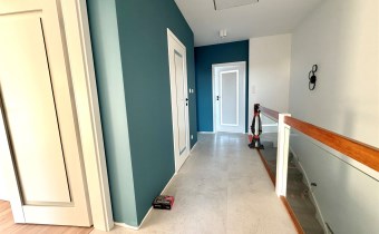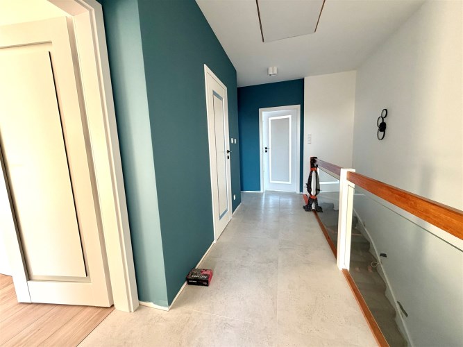 Piętro : 4 sypialnie ( podłogi panele),  łazienka z kabina i wanną ( glazura i terakota)