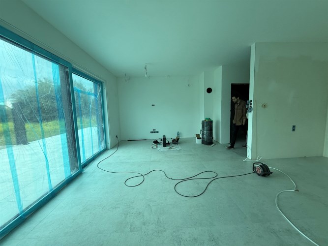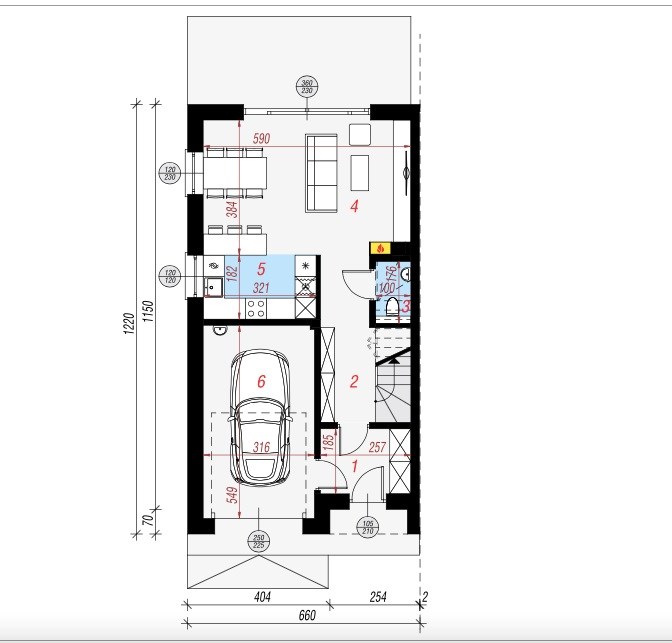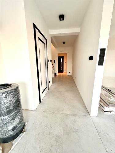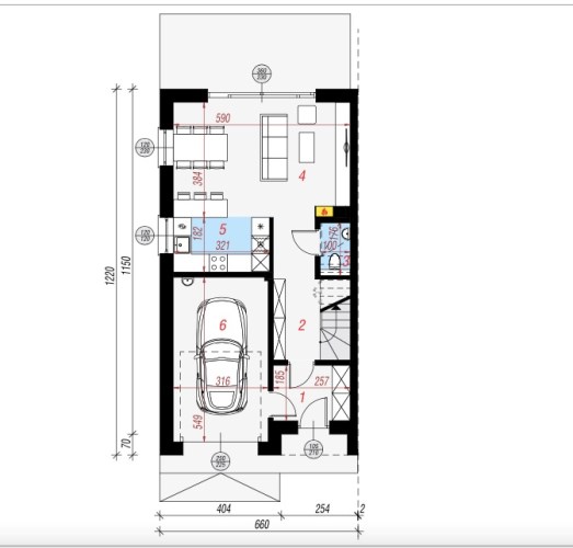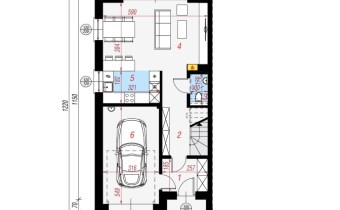 salon połączony z aneksem kuchennym, wyjście na duży taras, wc , z holu przejście do garażu.