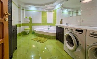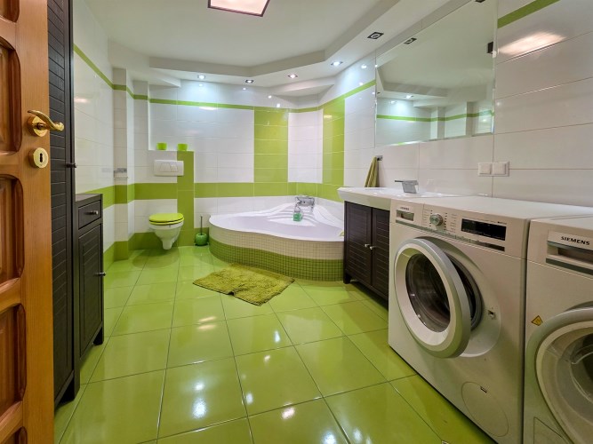 - Kuchnia: w pełni wyposażona w nowoczesny sprzęt AGD (płyta indukcyjna, zmywarka, piekarnik elektryczny)