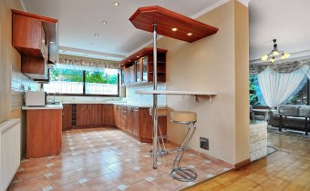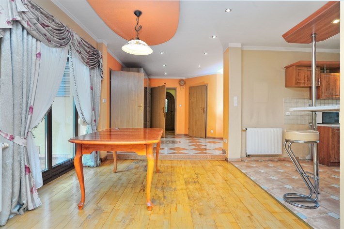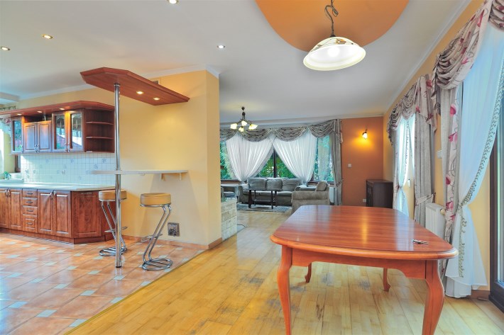 jasny salon połączony z kuchnią i jadalnią, z wyjściem na zadaszony taras oraz do ogrodu,