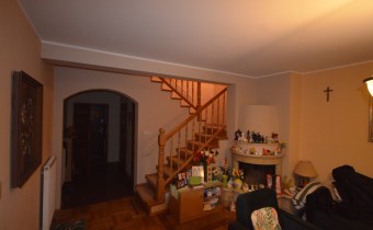 Na parterze salon z kominkiem i wyjściem na taras i do zagospodarowanego ogrodka ,otwarta kuchnia oraz łazienka z wc, przejście do długiego garażu.