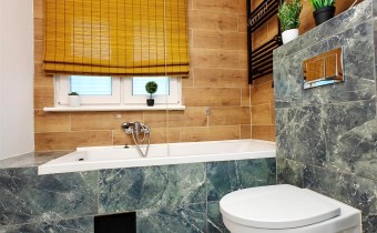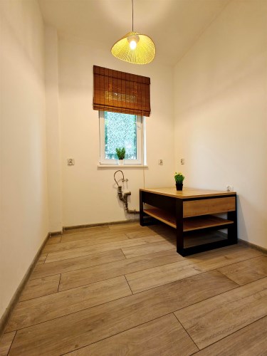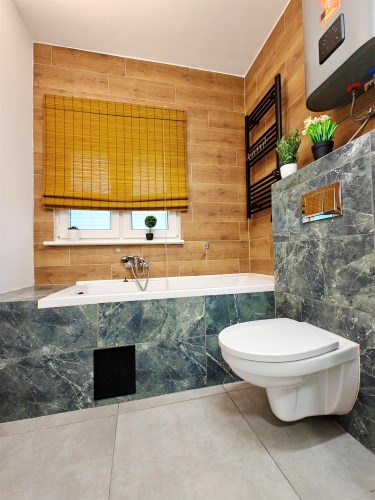 nowo wyremontowana łazienka z wanną (bojler elektryczny, miejsce na pralkę, grzejnik).