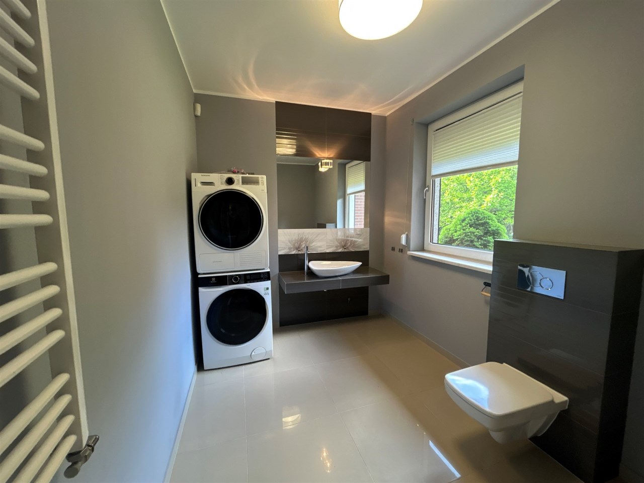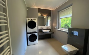 Wyposażenie łazienki lustro, pralka, prysznic, umywalka, wanna z hydromasażem, WC