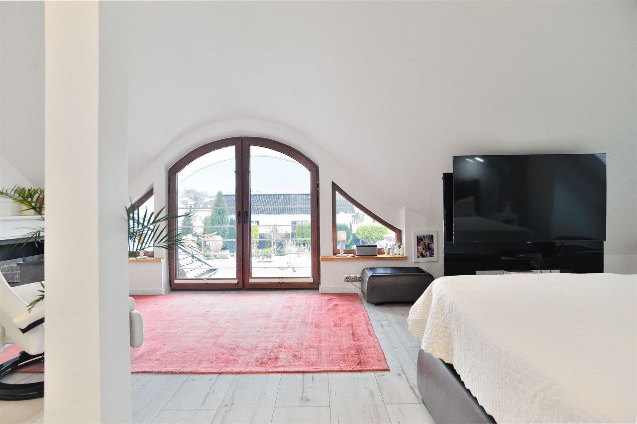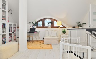 Pietro: sypialnia z oknem na ogród i garderobą, pokoj, zagospodarowany hol w z biblioteką i drugim biurem, oraz pokój kąpielowy.