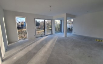z wyjściem na taras i do ogrodu. Duże okna zapewniają dostęp naturalnego światła.