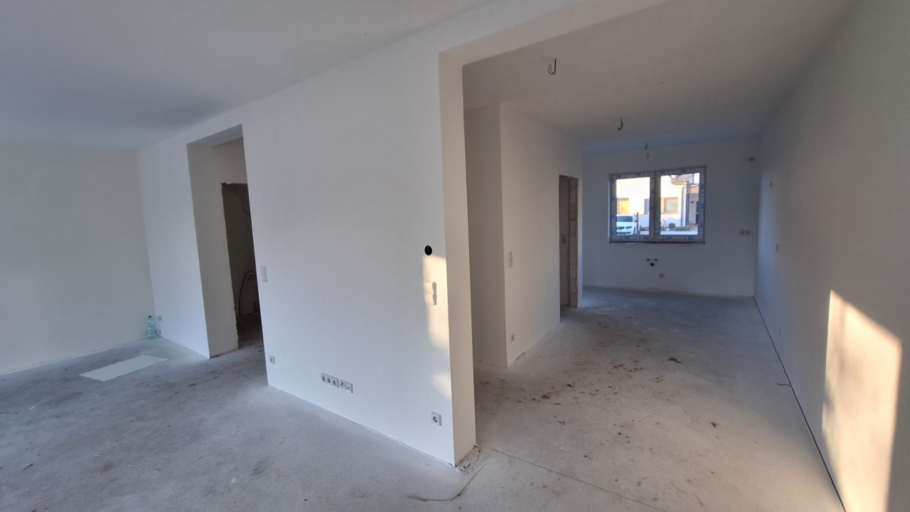 wiatrołap, łazienka, pomieszczenie gospodarcze, przestronny salon z aneksem kuchennym (spiżarnią) i jadalnią,