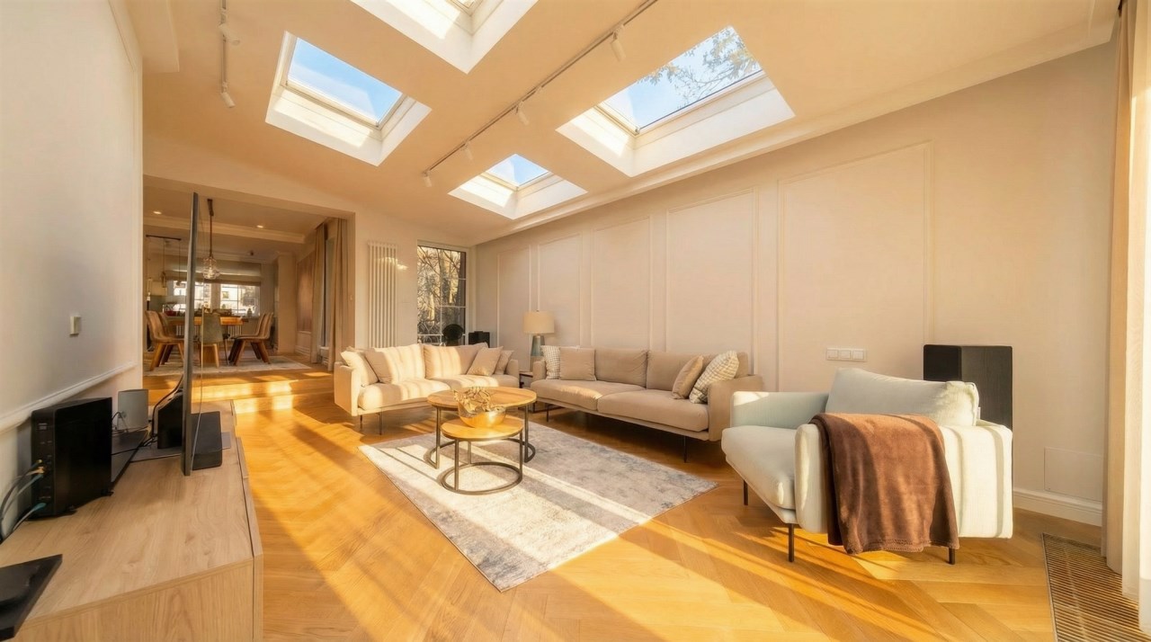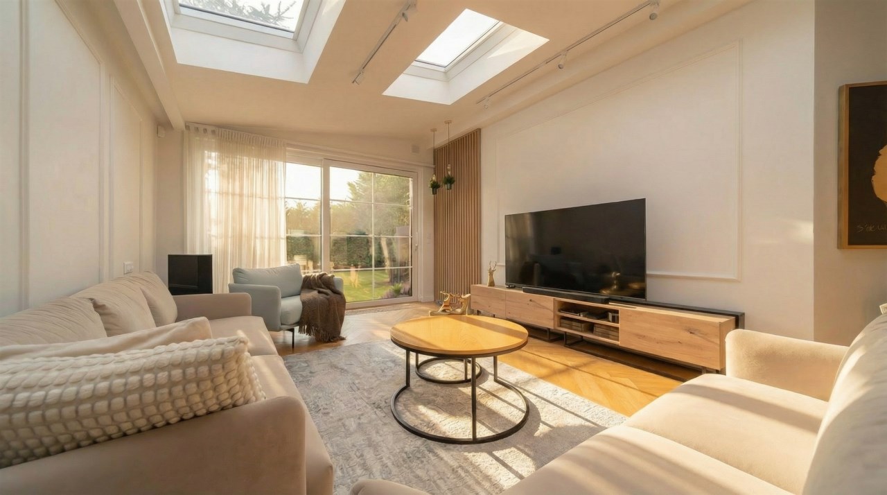 - przestronny salon ze świetlikiem dzięki czemu przestrzeń jest pięknie doświetlona