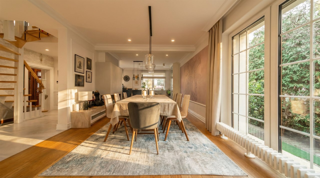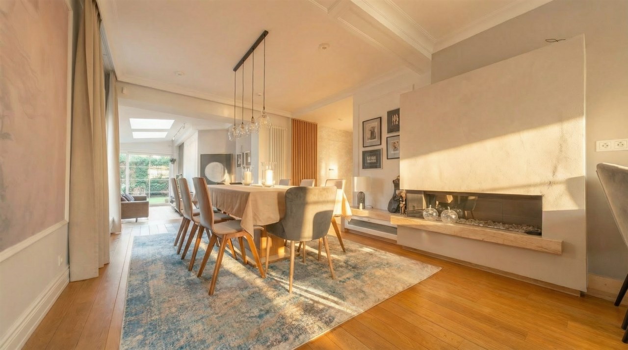 - otwarta jadalnia z dużym stołem i kominkiem
