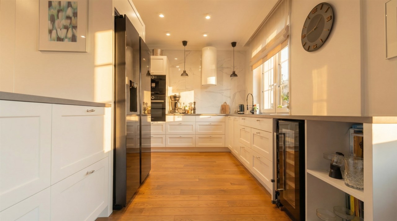 -przestronny korytarz z licznymi szafami w zabudowie