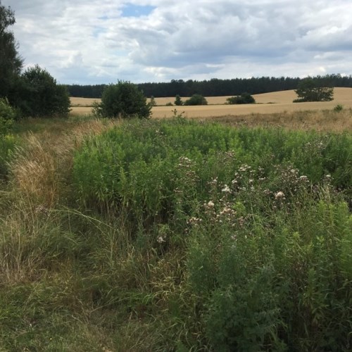 Wokół: niska zabudowa, dużo zieleni, pola, łąki i lasy.