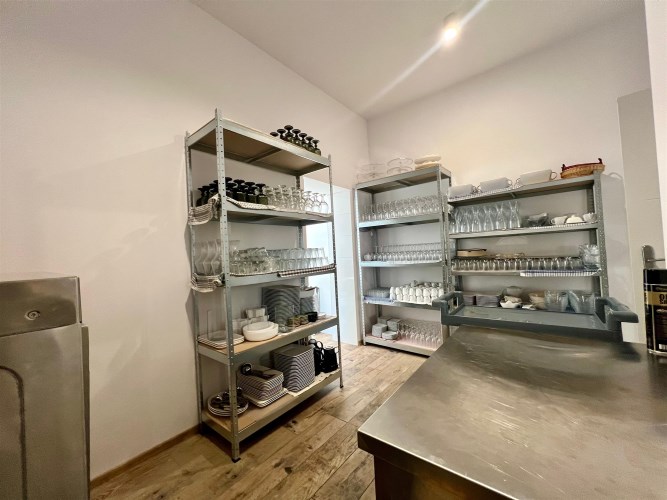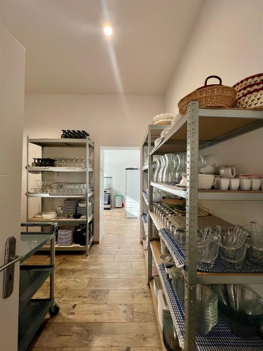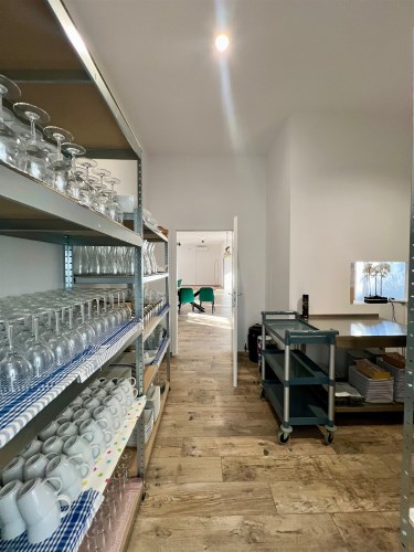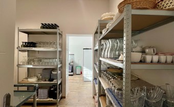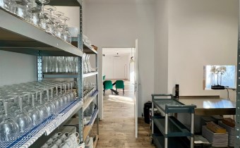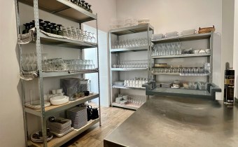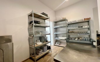 •    Zaplecze wyposażone: zmywak, zmywarka, lodówka, mikrofala, kuchenka podręczna, stoły robocze,