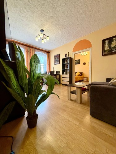 • Układ mieszkania: 2 pokoje, kuchnia, łazienka i przedpokój, centralny salon.