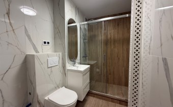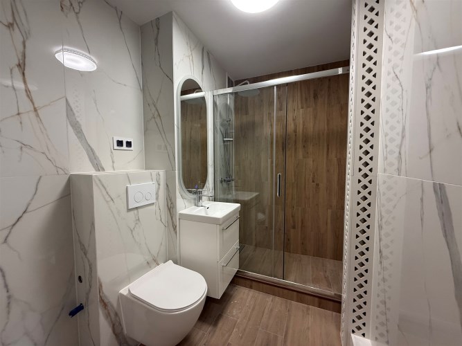 łazienka po remoncie, wyposażona w kabinę prysznicową