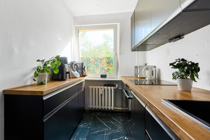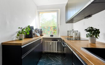 - Oddzielna, jasna kuchnia z meblami i sprzętem AGD