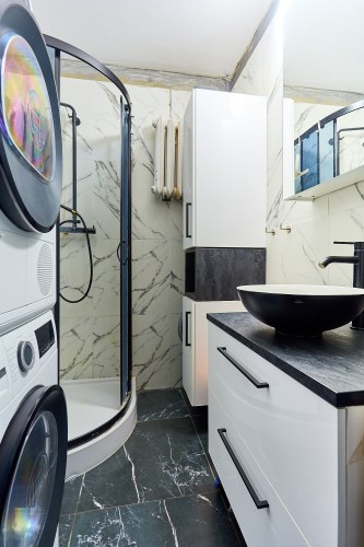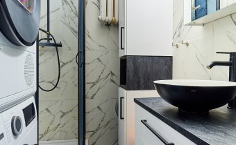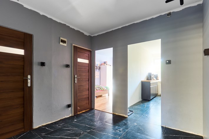 - Na podłogach panele oraz gres w charakterystycznych ciemnych kolorach