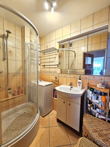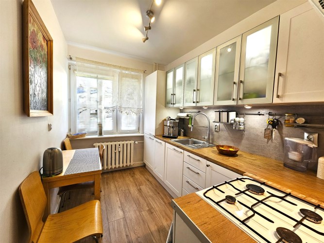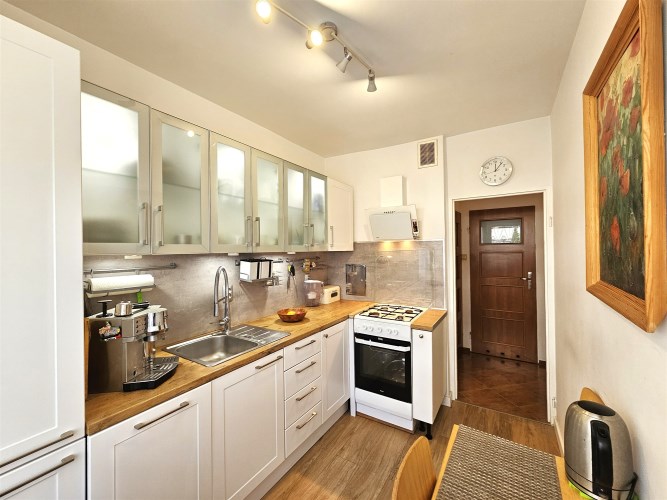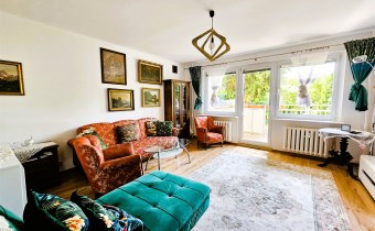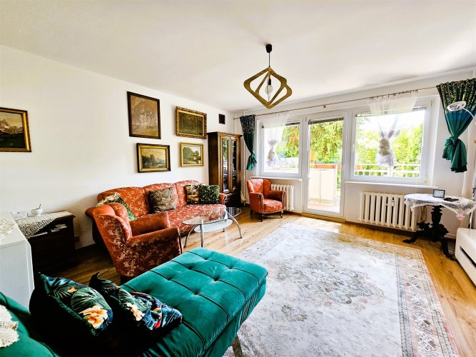 Mieszkanie o powierzchni 49,4 m2. Składa się z przestronnego salonu, sypialni, oddzielnej kuchni z oknem, łazienki z kabiną prysznicową, oddzielnego WC oraz korytarza. Z salonu wyjście na duży balkon, a z niego bezpośrednie zejście do ładnie zagospodarowanego ogródka. Ogrzewanie i ciepła woda z sieci miejskiej. Mieszkanie ciepłe środkowe. Co roku występują duże zwroty z tytułu ogrzewania.