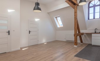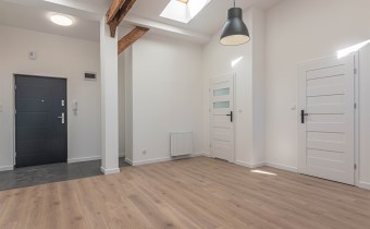 Lokal wykończony pod klucz, w pokojach na podłodze nowe panele, ściany gładzone, malowane, stolarka drzwiowa nowa. Okna połaciowe, drewniane Velux. Kuchnia w formie aneksu umeblowana i wyposażona w sprzęt AGD: płyta elektryczna, piekarnik elektryczny, okap oraz nowa, zabudowana lodówka z zamrażalką. Podłoga w części aneksu wyłożona terakotą. Łazienka razem z wc, duża kabina prysznicowa, na podłodze terakota, ściany wyłożone glazurą, w łazience miejsce na pralkę. W przedpokoju na podłodze terakota, drzwi nowe, antywłamaniowe.