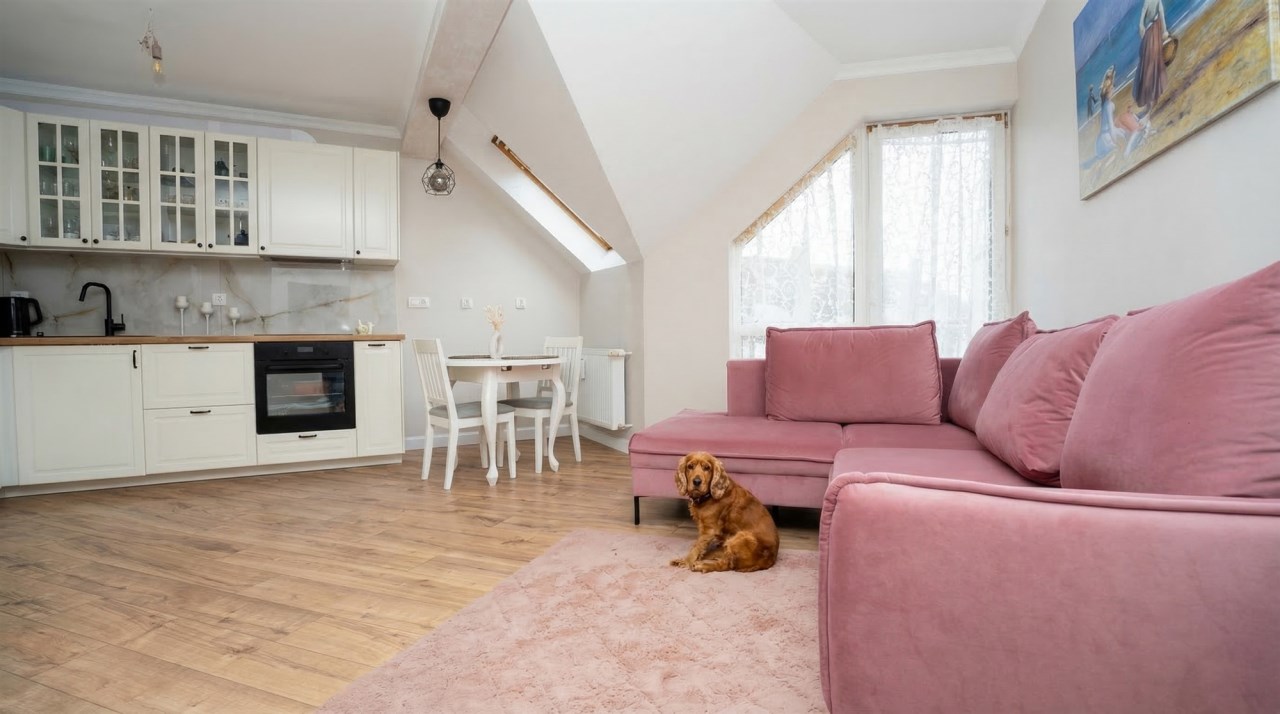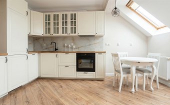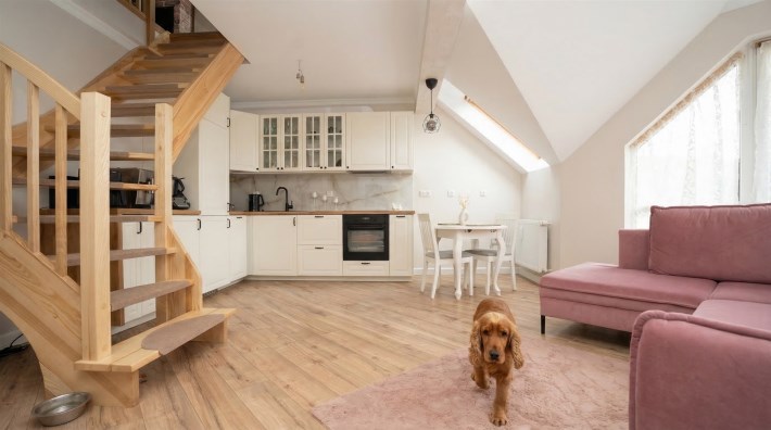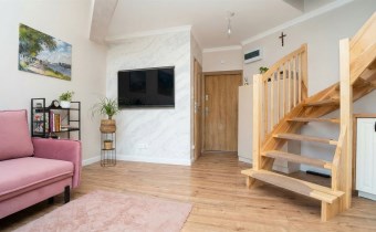 Mieszkanie w 2025 roku przeszło generalny remont, łącznie z wymianą instalacji. Na obu poziomach na podłogach nowe wysokogatunkowe  panele. Kuchnia w nowoczesnej zabudowie pod wymiar wraz z nowym sprzętem AGD (zmywarka, indukcja, piekarnik). Z salonu wyjście na spory balkon z ładnym widokiem. Zostały również zrobione nowe drewniane, szerokie  schody. Na II poziomie stałe zabudowy, obecnie podzielony jest na część wypoczynkową oraz strefę sypialnianą.