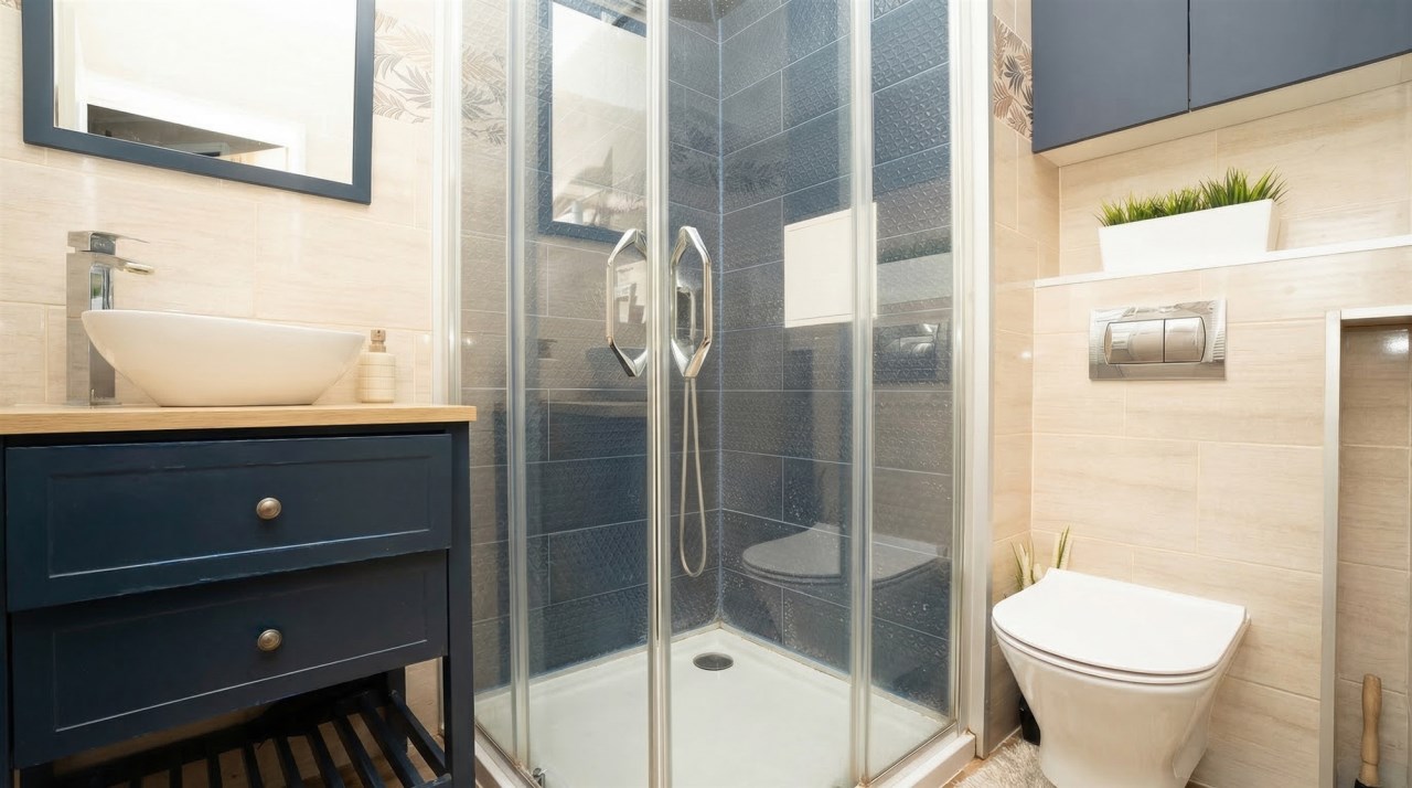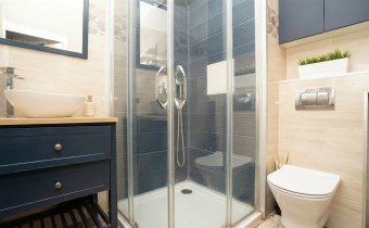 Na I poziomie łazienka z prysznicem w nowoczesnym stylu.
