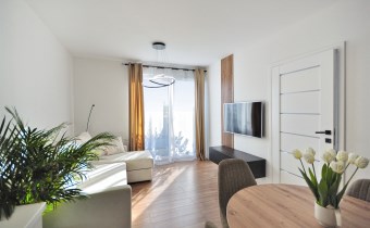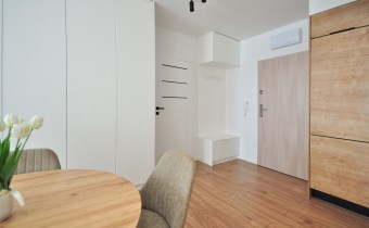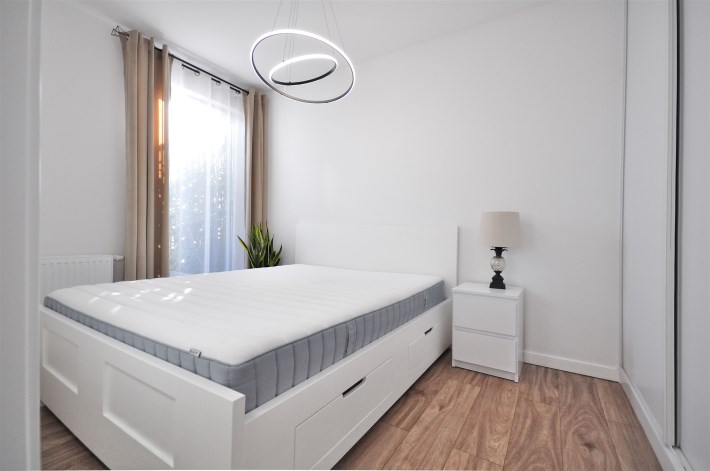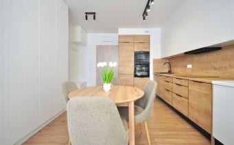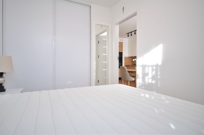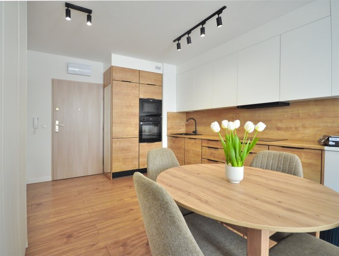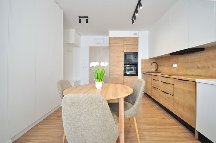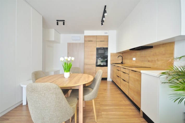 Salon dzienny z aneksem kuchennym, sypialnia osobno. Z obu pokoi wyjście na balkon.