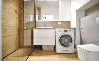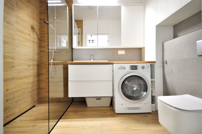 Wyposażenie łazienki kabina prysznicowa, lustro, pralka, umywalka, WC
