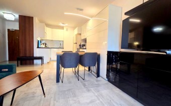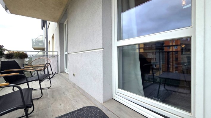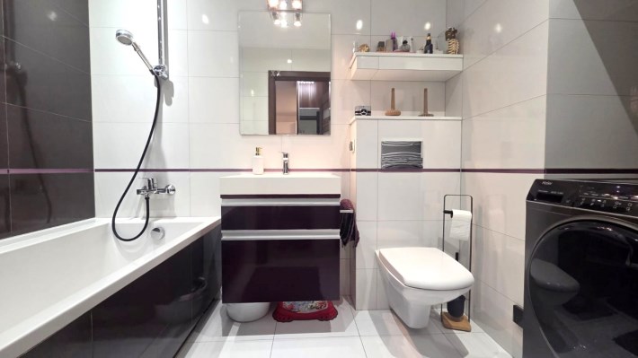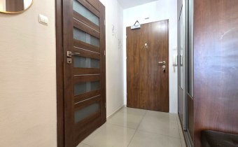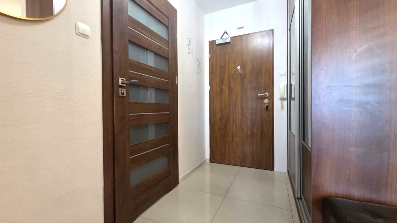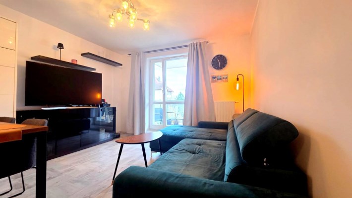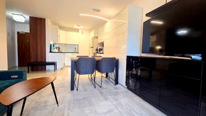 Składa się z przestronnego salonu, w którym oprócz wygodnego narożnika znajduje się pełnowymiarowe łóżko chowane w eleganckiej zabudowie meblowej w połysku – praktyczne rozwiązanie, które pozwala zachować przestrzeń i estetykę wnętrza. Kuchnia jest osobna, w pełni wyposażona i gotowa do użytku, natomiast w łazience znajduje się wanna oraz pralka. W przedpokoju umieszczono dużą szafę w zabudowie, co dodatkowo zwiększa funkcjonalność mieszkania.