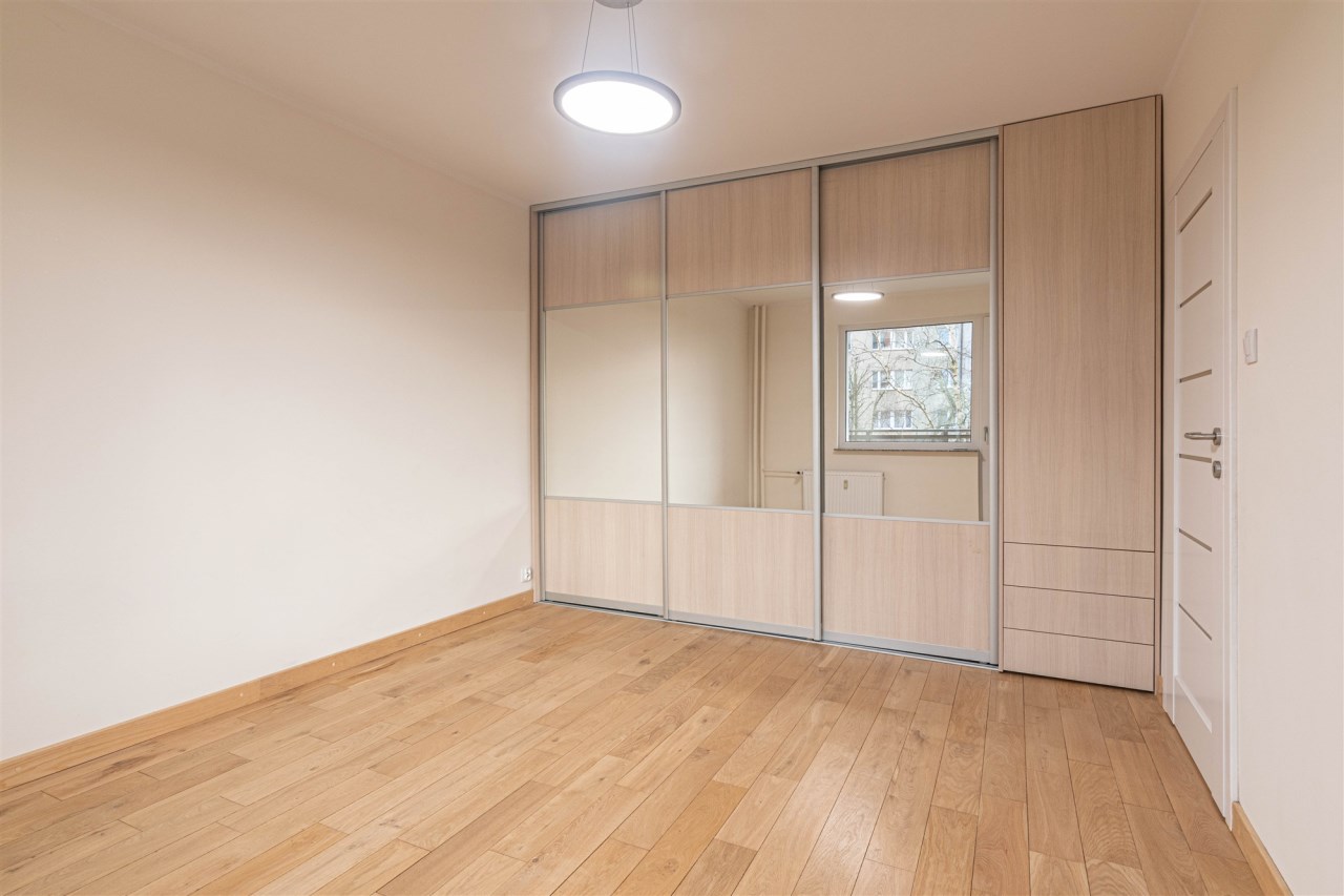 Kuchnia w formie aneksu umeblowana i wyposażona w sprzęt AGD: płyta indukcyjna, piekarnik elektryczny, zabudowana kuchenka mikrofalowa, zmywarka oraz nowa, zabudowana lodówka z zamrażalką. Podłoga w części aneksu i fartuch roboczy wykonane z marmuru. Nad aneksem podwieszany sufit, docieplony wełną akustyczną. W pokoju dziennym i sypialni z balkonem znajdują się szafy w zabudowie.