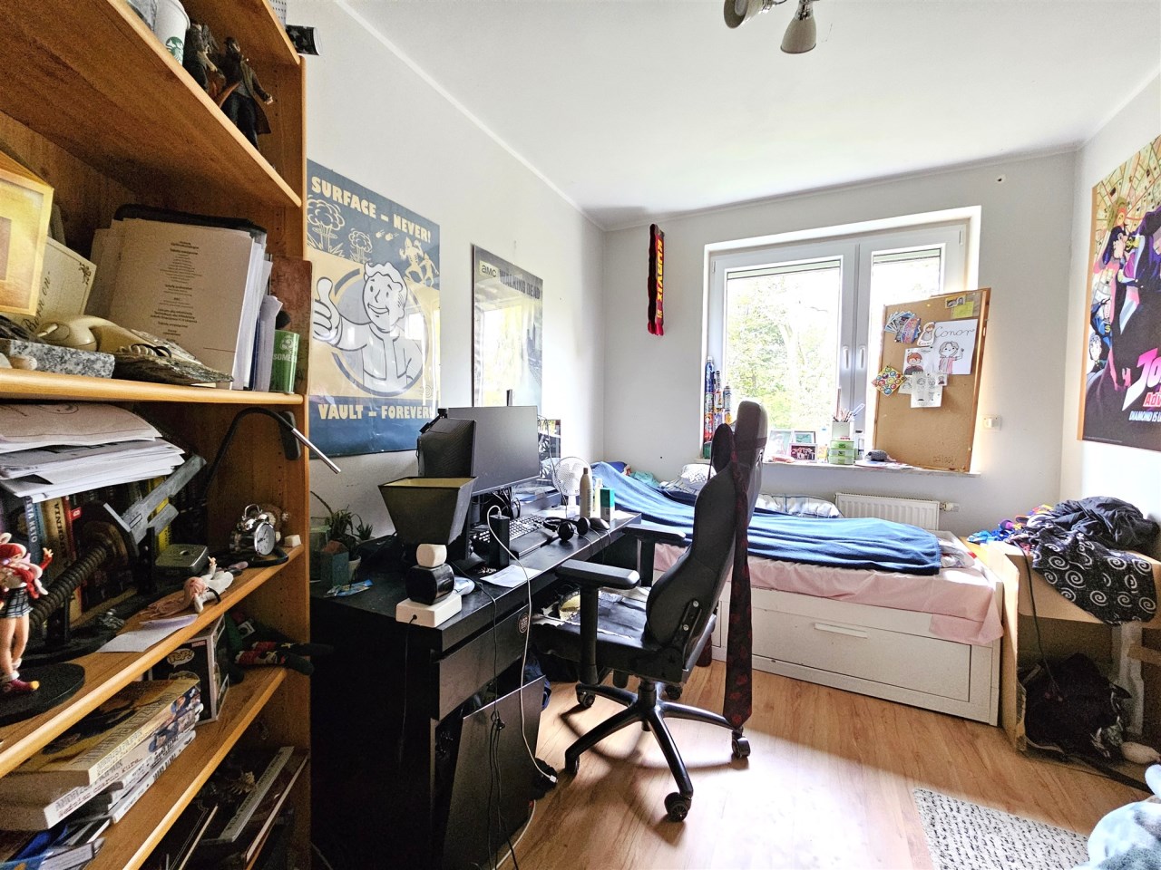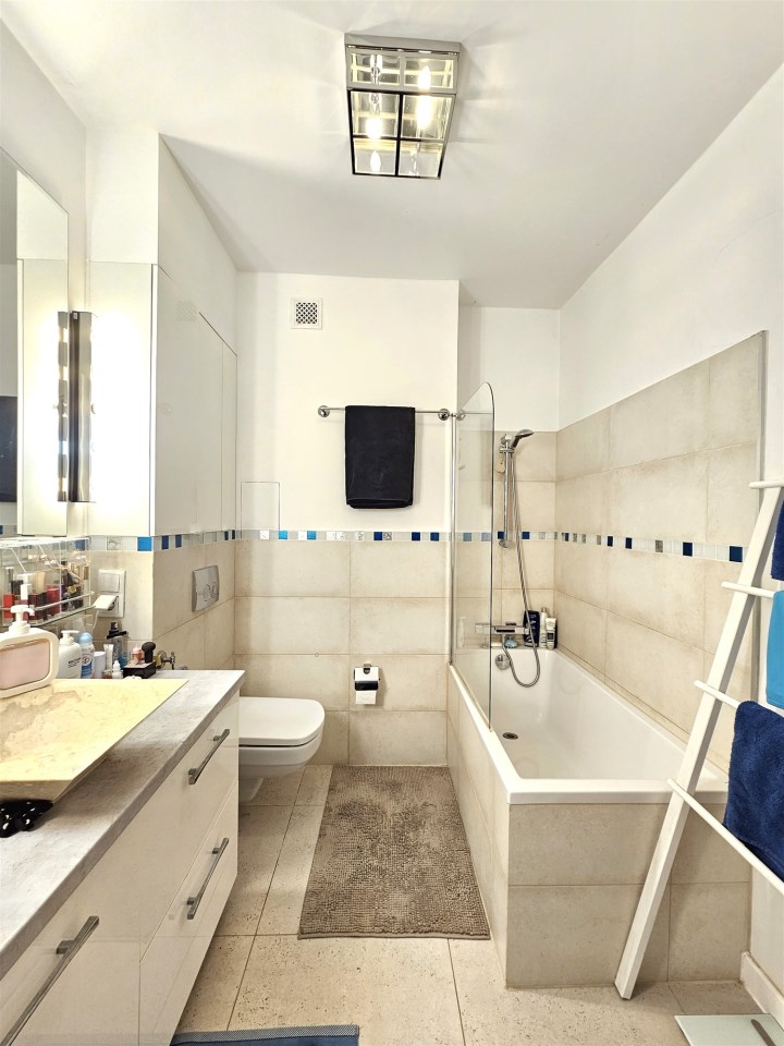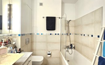 Łazienka po remoncie. W pokojach na podłodze panele. W cenie mieszkania pozostaje zabudowa kuchenna ze sprzętem AGD (piekarnik, płyta indukcyjna, zmywarka i pochłaniacz) oraz stałe zabudowy w pozostałych pomieszczeniach.