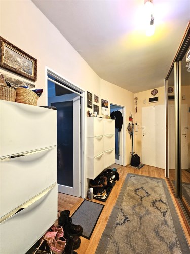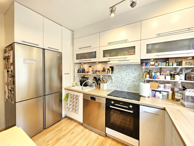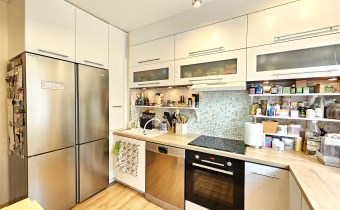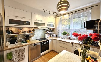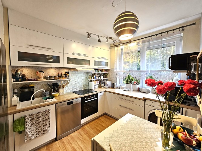 Łazienka po remoncie. W pokojach na podłodze panele. W cenie mieszkania pozostaje zabudowa kuchenna ze sprzętem AGD (piekarnik, płyta indukcyjna, zmywarka i pochłaniacz) oraz stałe zabudowy w pozostałych pomieszczeniach.