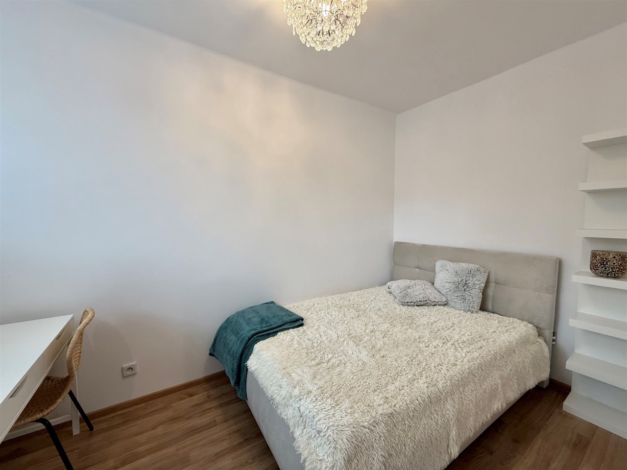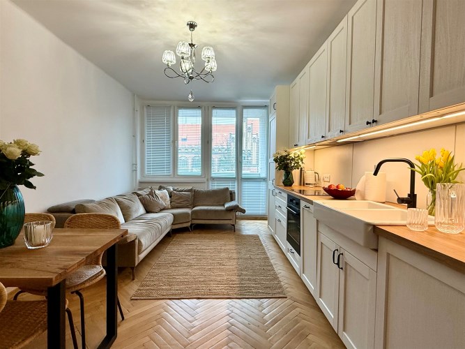 Mieszkanie składa się z salonu z aneksem kuchennym i wyjściem na balkon. Z salonu prowadzi wejście do jednej sypialni, a dodatkowo do dyspozycji są jeszcze dwa niezależne pokoje. W lokalu znajduje się łazienka z WC i kabiną prysznicową oraz wnęka na garderobę.