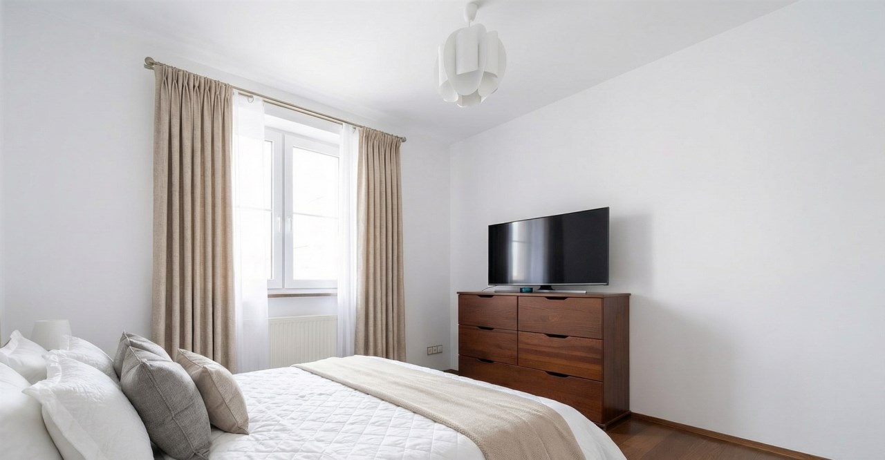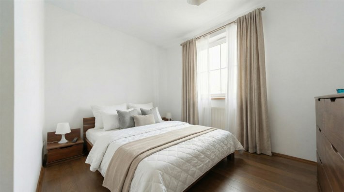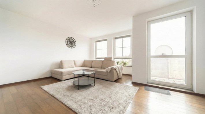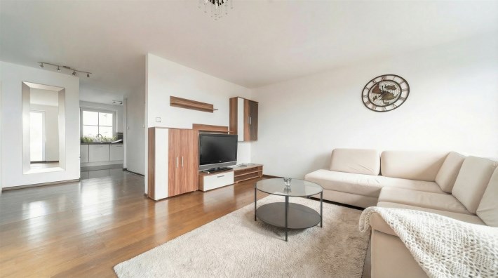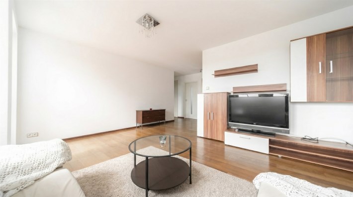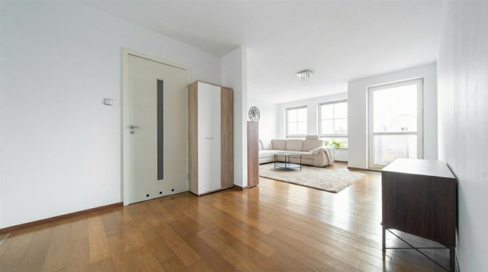 Wnętrze jest jasne i przytulne, a drewniana podłoga w kolorze ciemnego orzecha nadaje mieszkaniu elegancki charakter. Balkon stanowi dodatkową przestrzeń do wypoczynku.