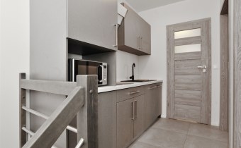 II poziom, dwie sypialnie z wyjściem na taras, łazienka z kabiną prysznicową oraz aneks kuchenny w korytarzu.