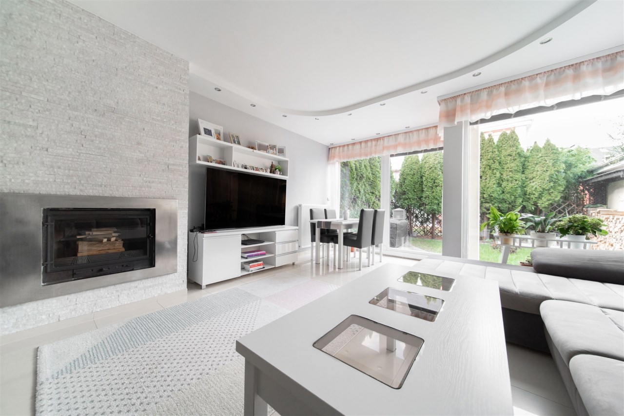 Kuchnia w nowoczesnej zabudowie, ze sprzętem AGD. Salon z kominkiem, jasny z ładnie zaprojektowanym oświetleniem. Na tym poziomie znajduje się również toaleta z umywalką. Z poziomu 0 schodami wchodzimy na 1 piętro o powierzchni 37 metrów. Znajdują się tam dwie duże sypialnie, każda z balkonem oraz duża łazienka/pokój kąpielowy z prysznicem i wanną.