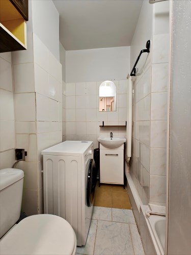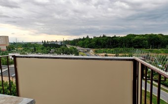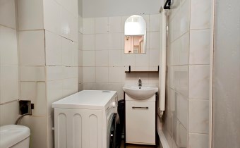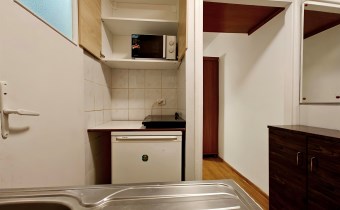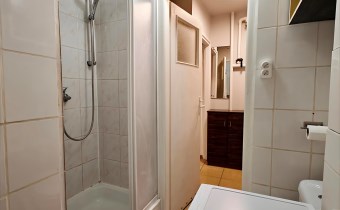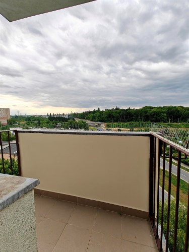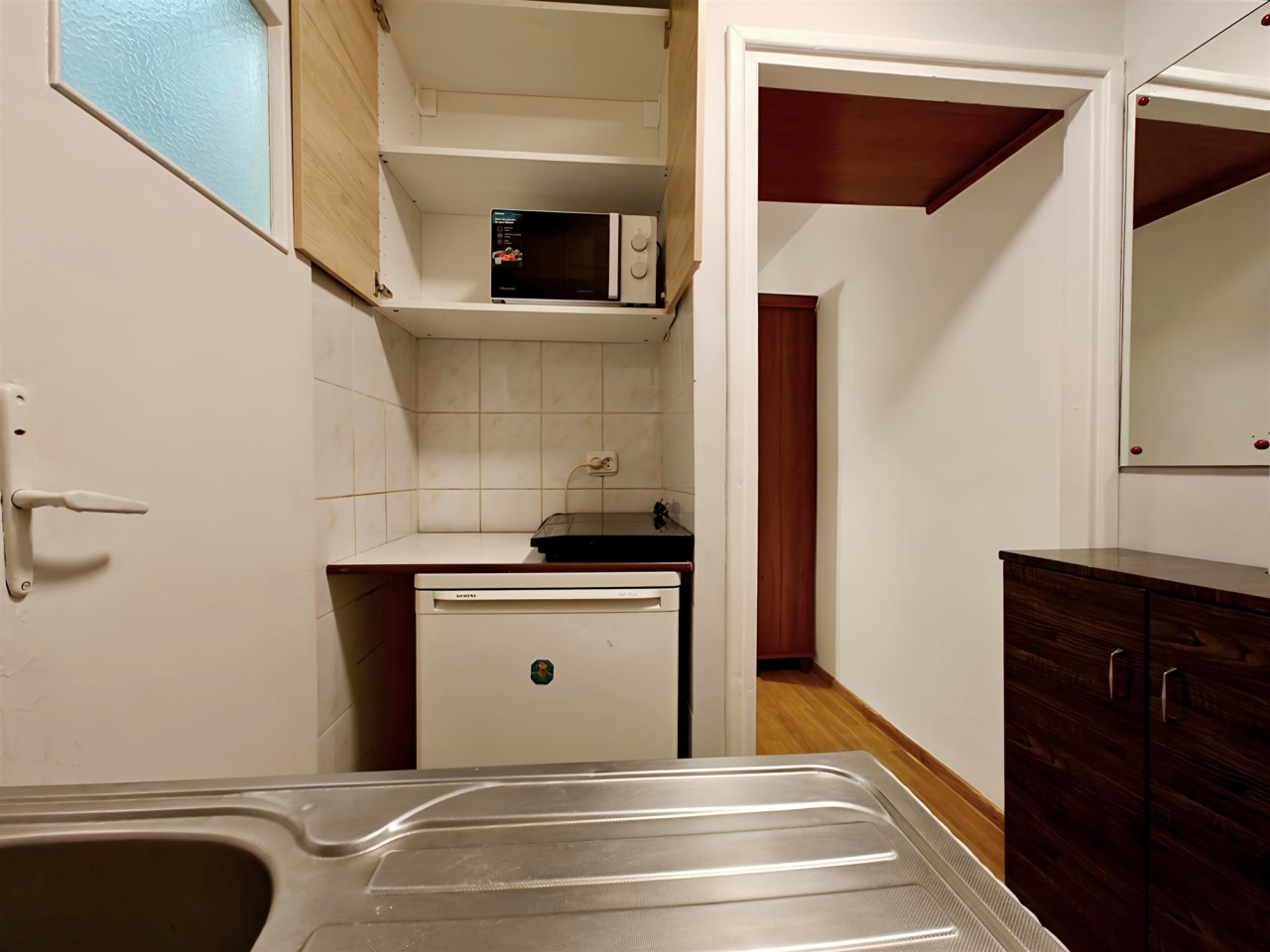 Układ pomieszczeń obejmuje: pokój dzienny z wyjściem na balkon (ok. 2,2 m²), aneks kuchenny oraz łazienkę z prysznicem i WC. Mieszkanie jest w pełni umeblowane i wyposażone: rozkładana kanapa, stół z dwoma krzesłami, szafa w zabudowie, komoda, nowa pralka, lodówka, mikrofalówka oraz nowe meble kuchenne.