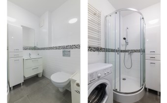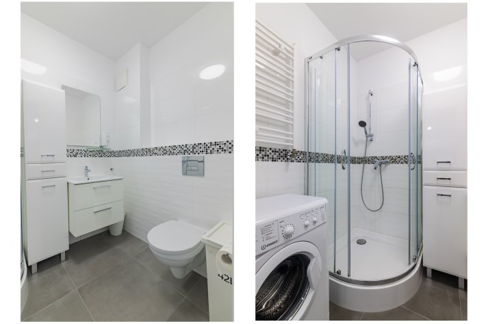 Wyposażenie łazienki kabina prysznicowa, lustro, pralka, umywalka, WC
