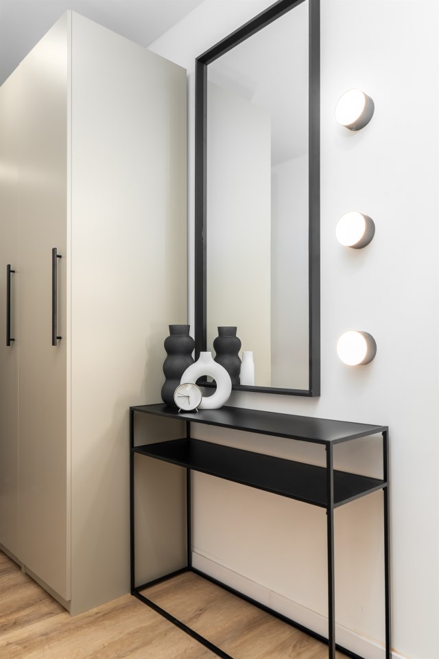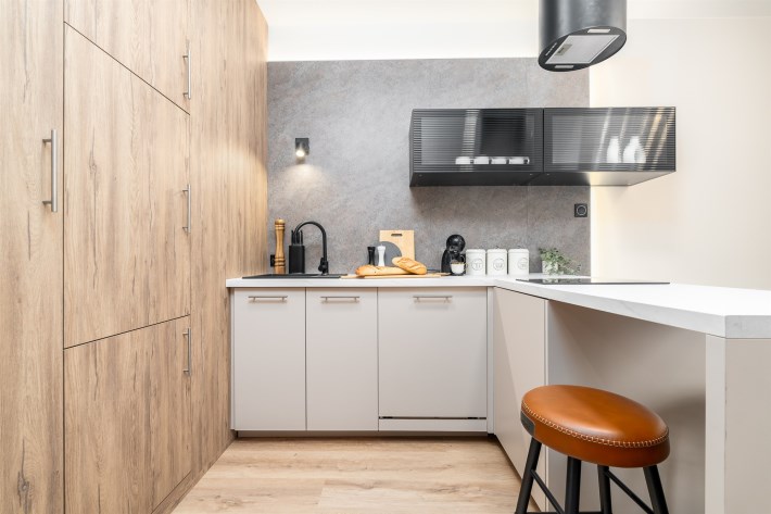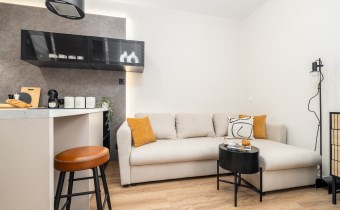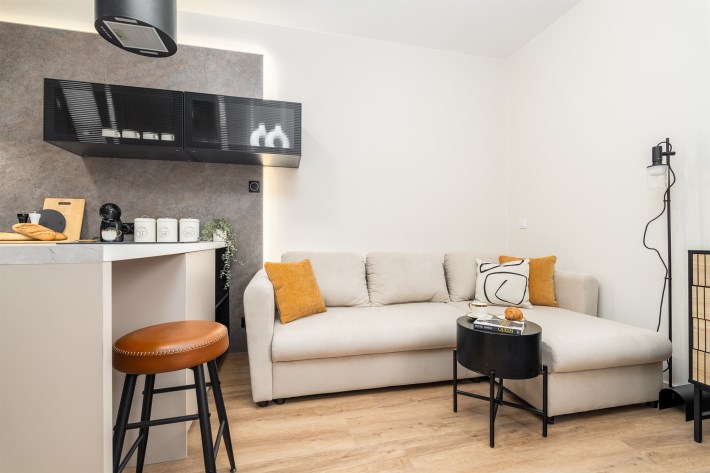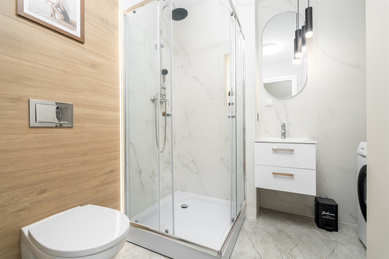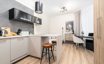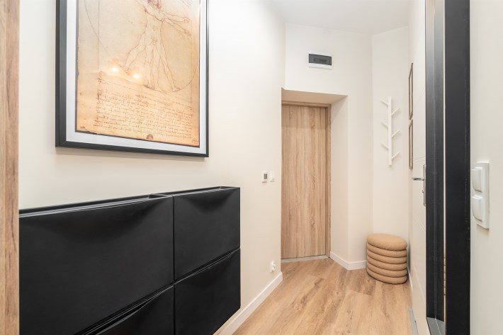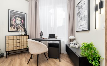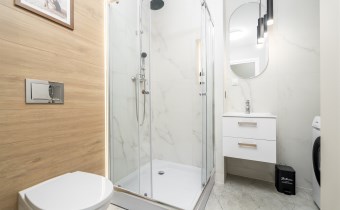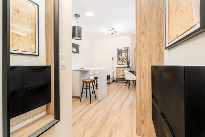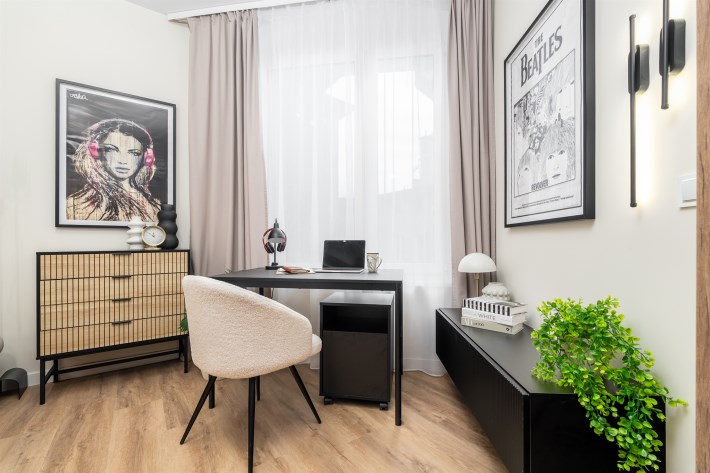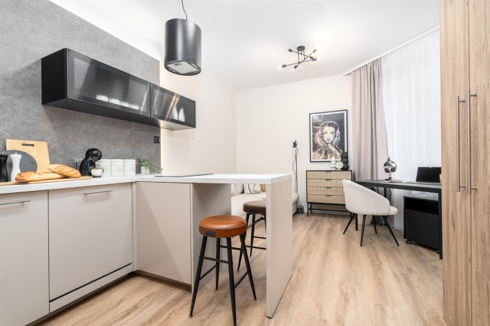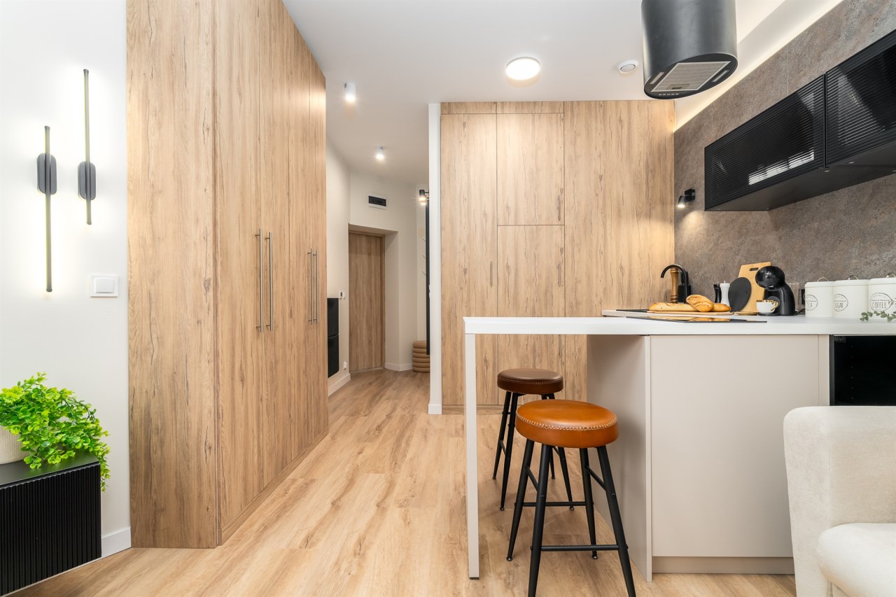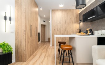Mieszkanie po remoncie kapitalnym, o południowej ekspozycji okien. Pokój dzienny z aneksem kuchennym, łazienka i korytarz. W pokoju i korytarzu na podłodze panele, ściany wygładzone, malowane. W pokoju wypoczynek, stolik kawowy, biurko, krzesło, komoda, stolik RTV, duża szafa ubraniowa i szafka na buty. Łazienka w glazurze i terakocie, kabina prysznicowa, muszla podwieszana typu geberit, umywalka, meble łazienkowe, lustro, pralka. Kuchnia kompletnie umeblowana i wyposażona: barek, dwa stołki barowe, duża lodówka z zamrażalnikiem, lodówka, płyta elektryczna, okap, zmywarka, mikrofala.