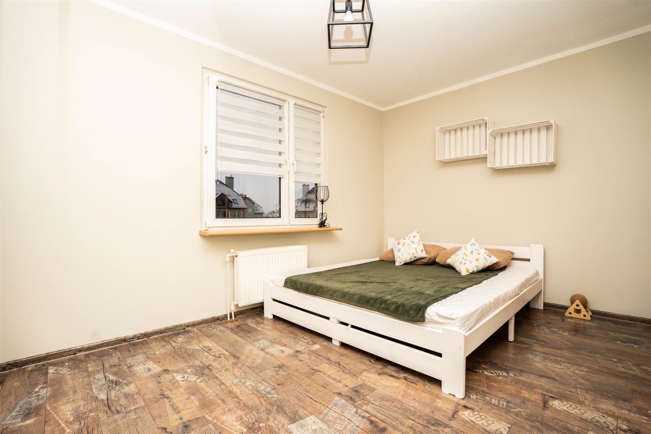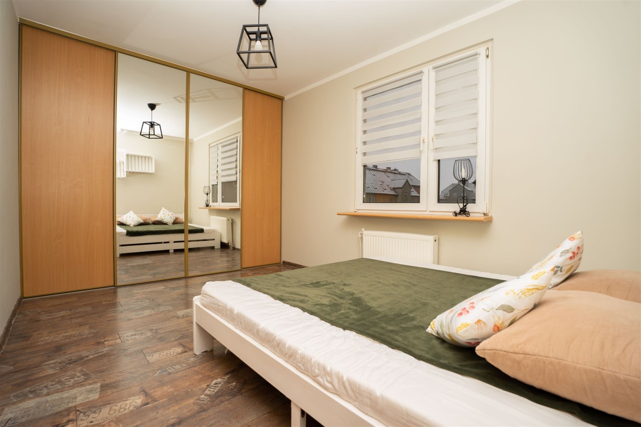 sypialnia wyposażona w łóżko o wymiarach 160 cm oraz pojemną szafę w zabudowie typu Komandor,