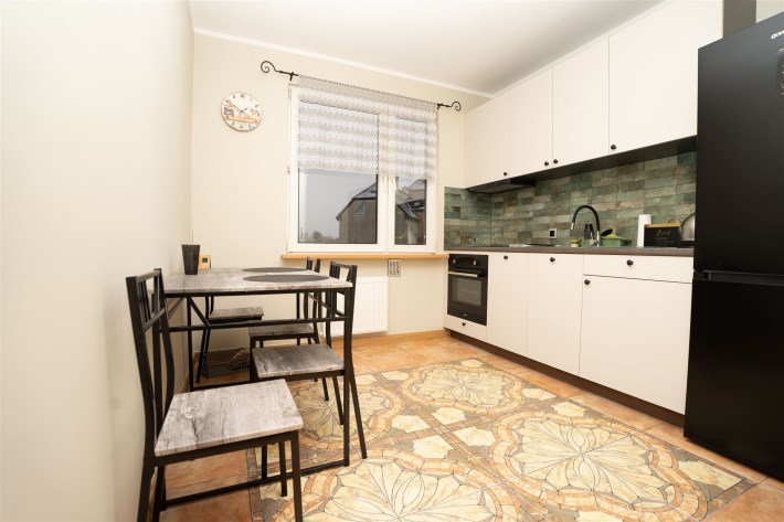 kuchnia w nowoczesnej zabudowie, w pełni wyposażona: kuchenka, piekarnik, zmywarka, stół z krzesłami,