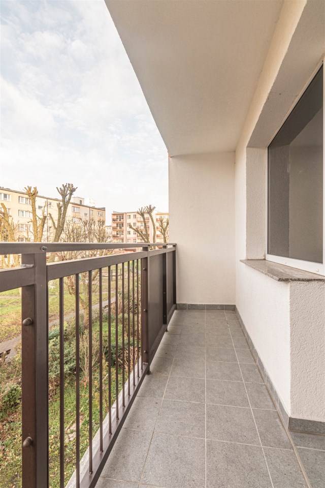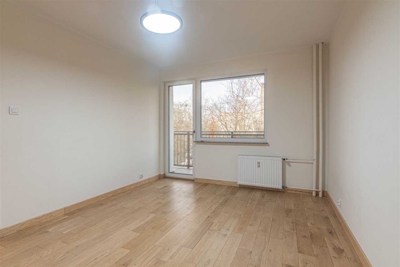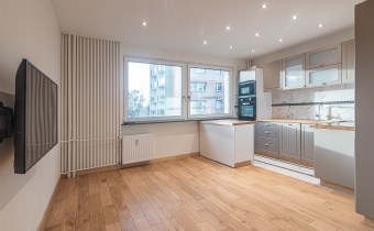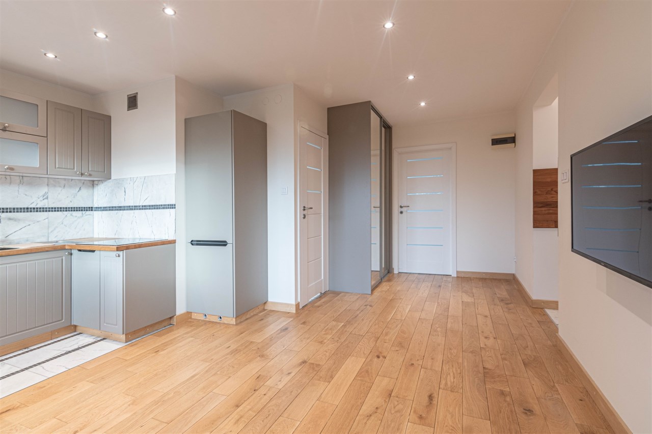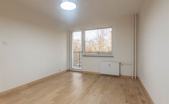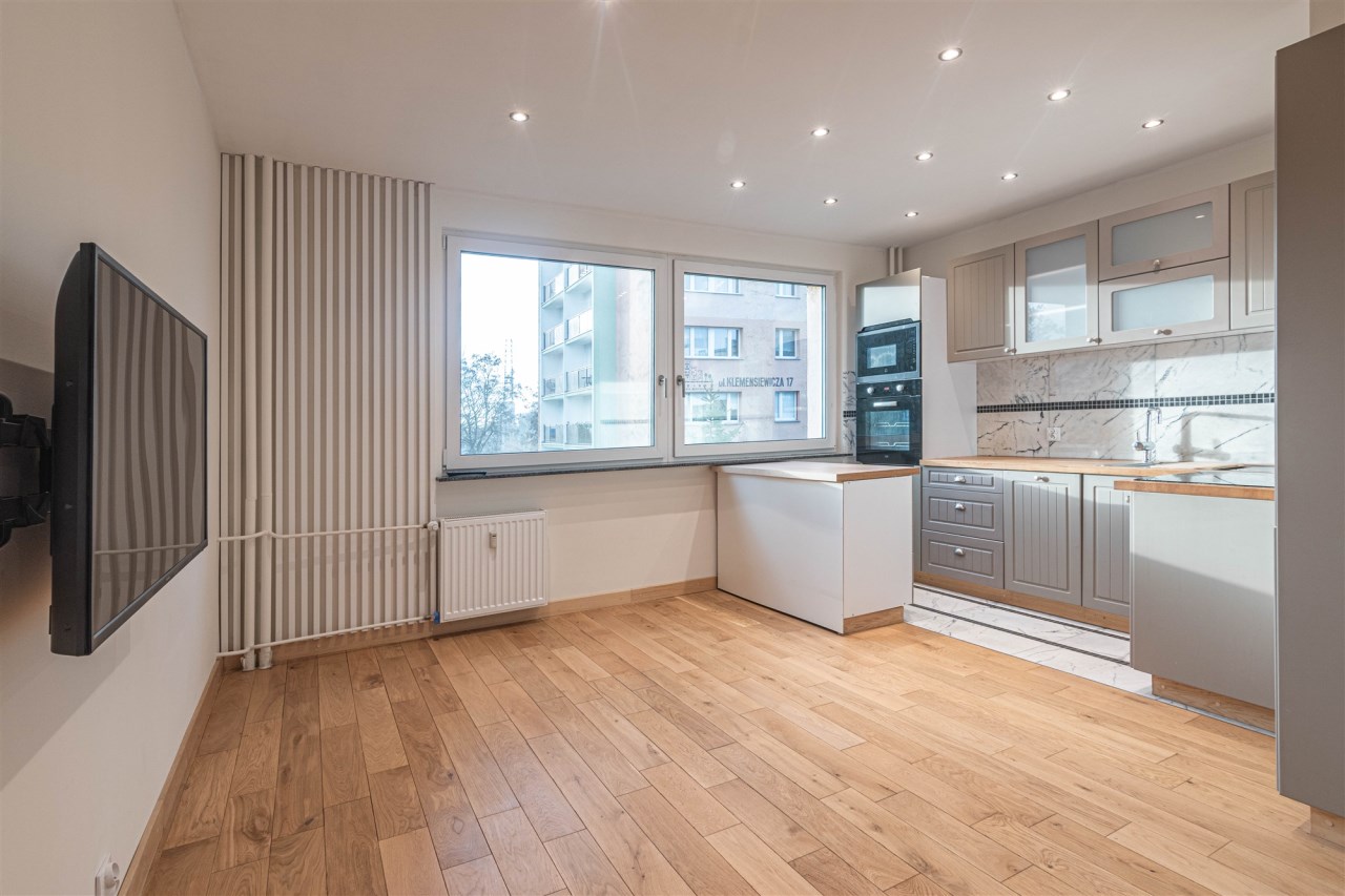 Mieszkanie zaaranżowane w nowoczesnym stylu - salon otwarty na przedpokój, połączony z aneksem kuchennym, duża sypialnia z balkonem i mały pokój. Łazienka połączona z wc. Lokal po remoncie generalnym.