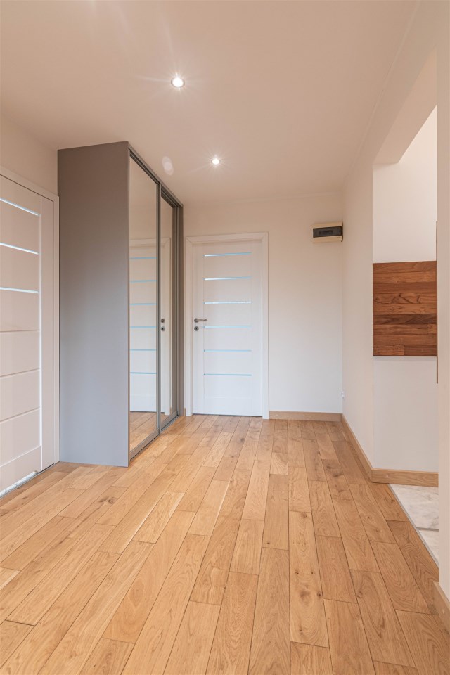 W sypialniach na podłogach deska dębowa, okna trzyszybowe okna PCV z filtrem UV - okna weneckie, zamontowane oświetlenie sterowane smartfonem.