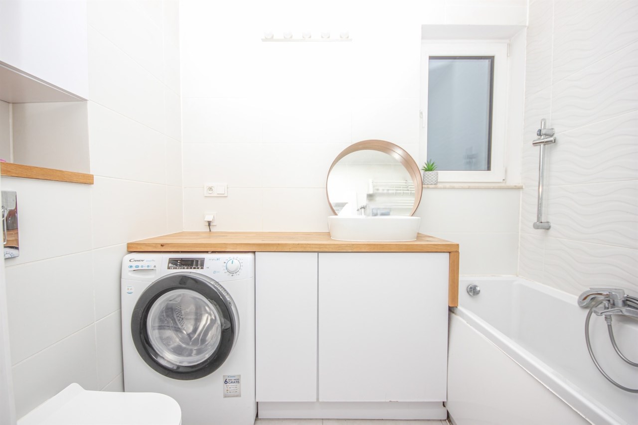- łazienka z wanną i pralką,
