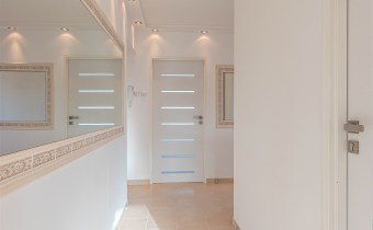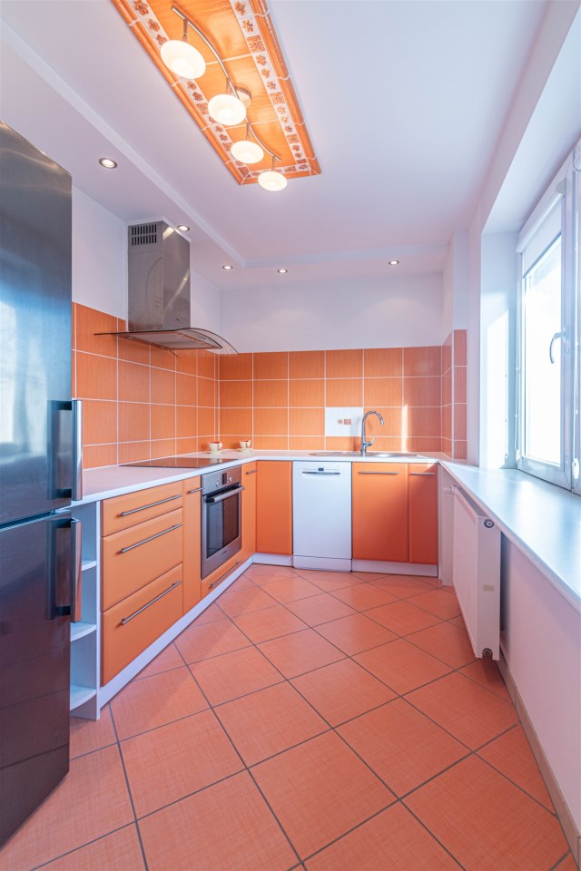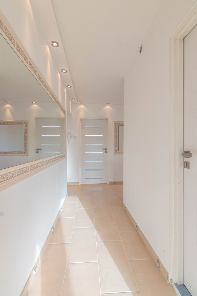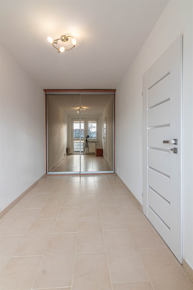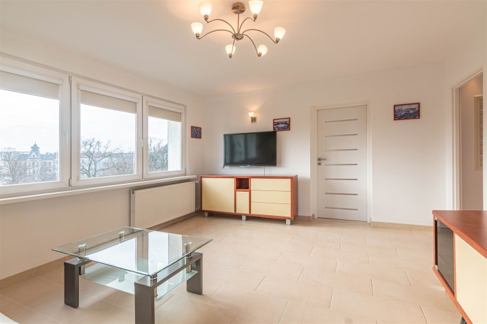 Mieszkanie w bardzo dobrym standardzie. Pokoje częściowo umeblowane, w pokoju dziennym wypoczynek skórzany, odbiornik TV, komody, w sypialni łóżko, stolik nocny, w drugiej sypialni szafa w zabudowie. W pokojach na podłodze terakota, ściany gładzone, malowane. Nowa stolarka drzwiowa, okna PCV, na oknach rolety przeciwsłoneczne. Kuchnia oddzielna, z oknem, umeblowana i wyposażona w sprzęt AGD: płyta elektryczna, piekarnik elektryczny, okap, zmywarka, duża lodówka z zamrażalnikiem, podświetlana szafa w zabudowie na drobny sprzęt AGD. Łazienka razem z wc, kabina prysznicowa, liczne szafki na bieliznę i ręczniki, łazienka wyposażona jest w pralkę. W przedpokoju szafa ubraniowa. Mieszkanie wyposażone w robota sprzątającego.