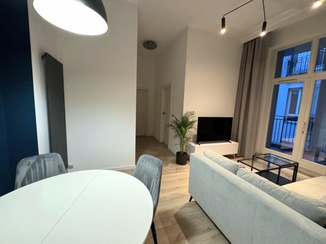 Mieszkanie zostało zaprojektowane przez architekta co łączy ze sobą styl z dużą funkcjonalnością, w pełni wyposażone we wszystkie sprzęty oraz umeblowane tak, aby przyszły najemca mógł wprowadzić się z tylko ze swoją walizką.