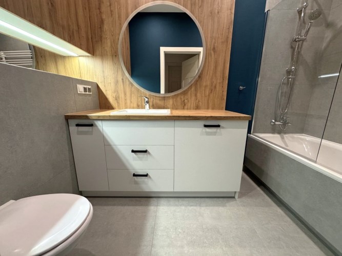 Wyposażenie łazienki lustro, pralka, umywalka na szafce, wanna, WC