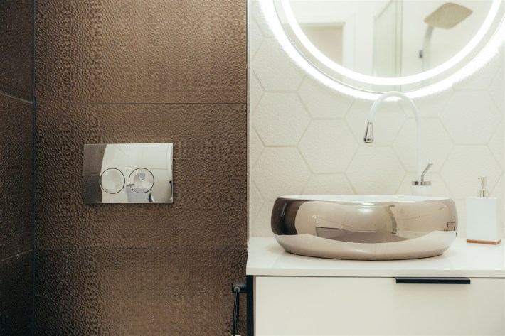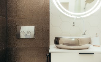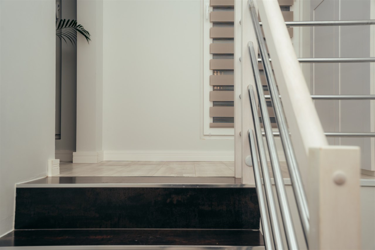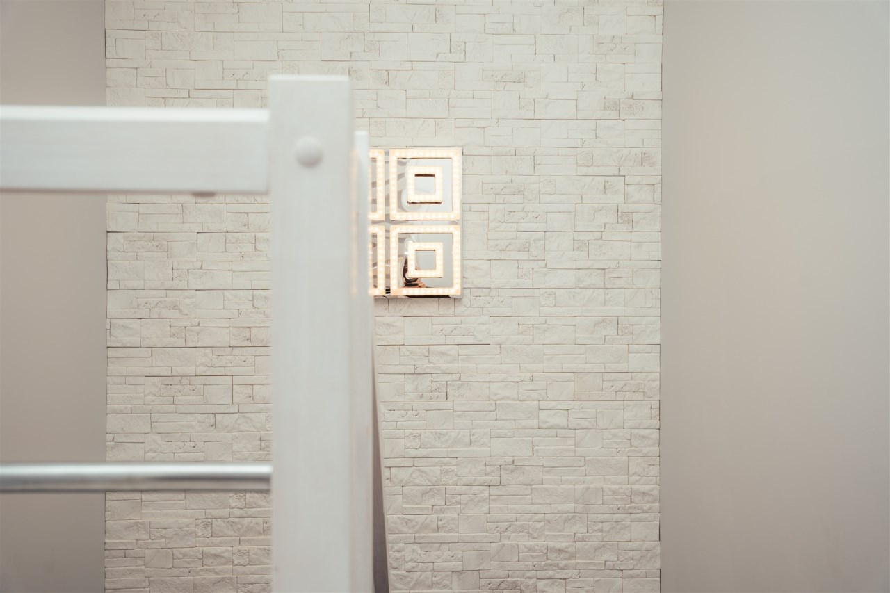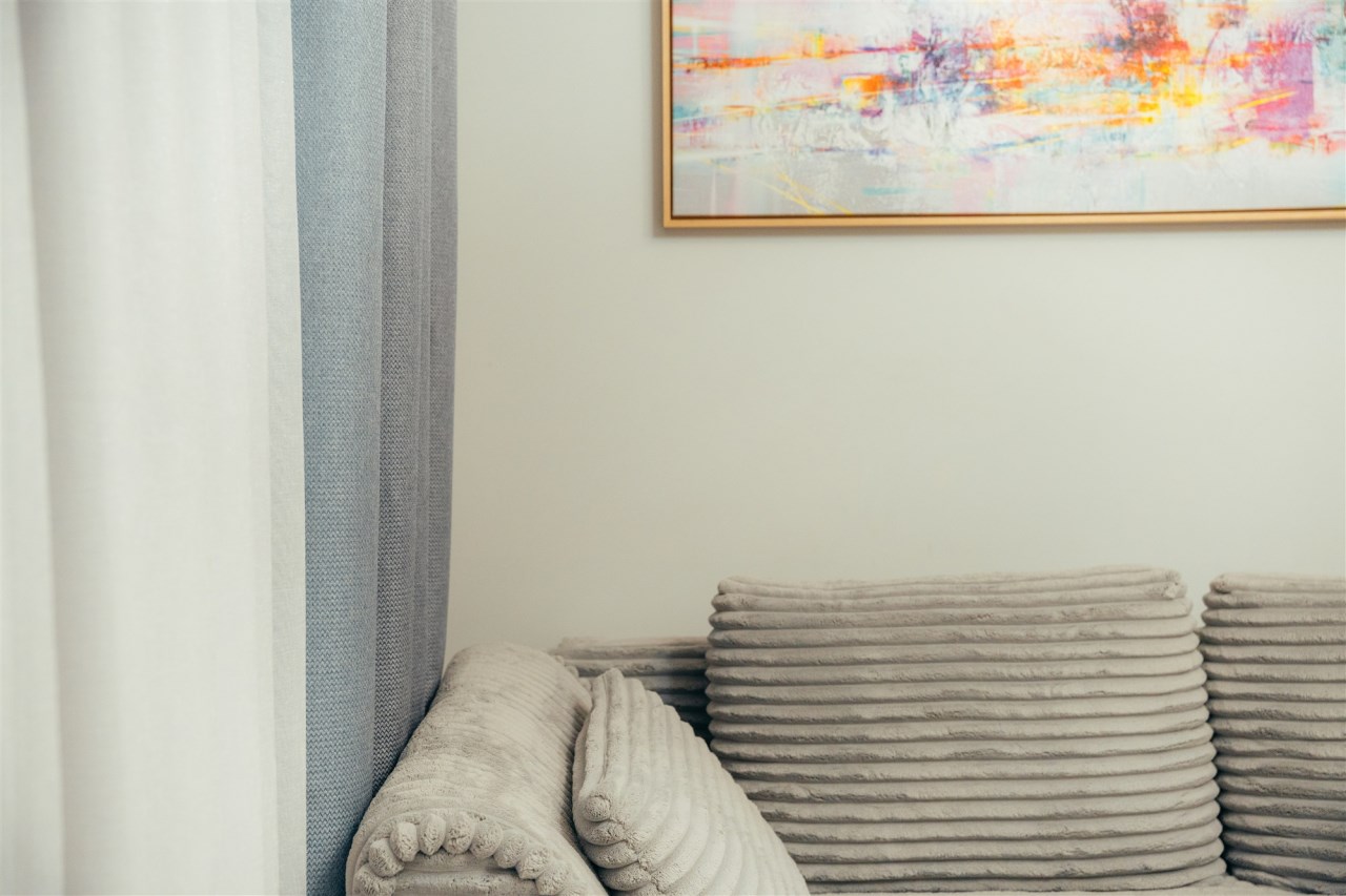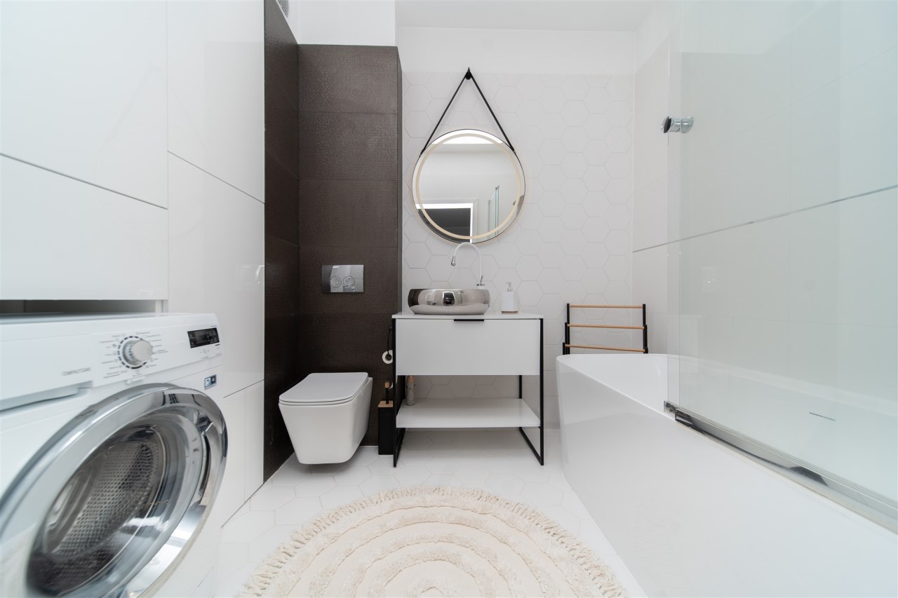 Dzięki zastosowaniu połączenia kolorystyki bieli oraz szarości mieszkanie oferuje spore poczucie przestrzeni.