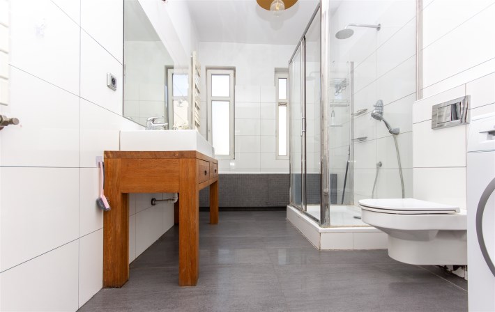 • duża łazienka z wanną i prysznicem oraz podwójną umywalką.