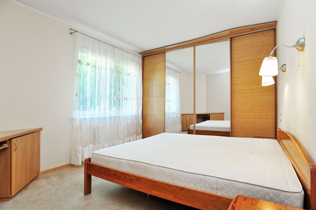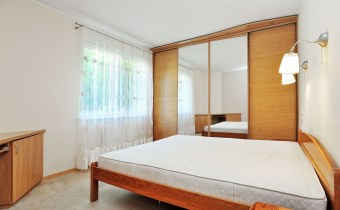 - Sypialnia (18m2) od strony północnej, od strony wejścia do mieszkania. Na podłodze wykładzina podłogowa. Biurko. Podłączenie do Internetu. Duża szafa typu Comandor z drzwiami suwanymi (4. częściowa) oraz oświetleniem od góry. Fronty szafy - ratan i duże tafle lustrzane.