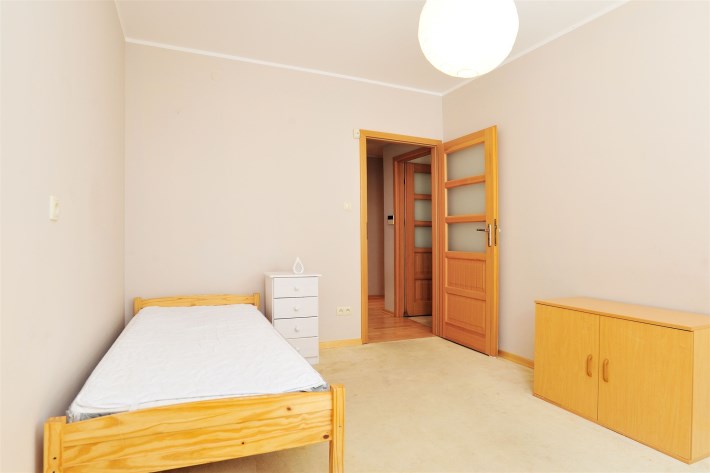 - Sypialnia (14m2) od strony wschodniej z dwoma oknami i widokiem na ogród przynależny do mieszkania. Pokój idealny dla 2 dzieci. Na podłodze wykładzina podłogowa. Łóżko 200x80. Szafki. Dużo biurko dla 2 osób.