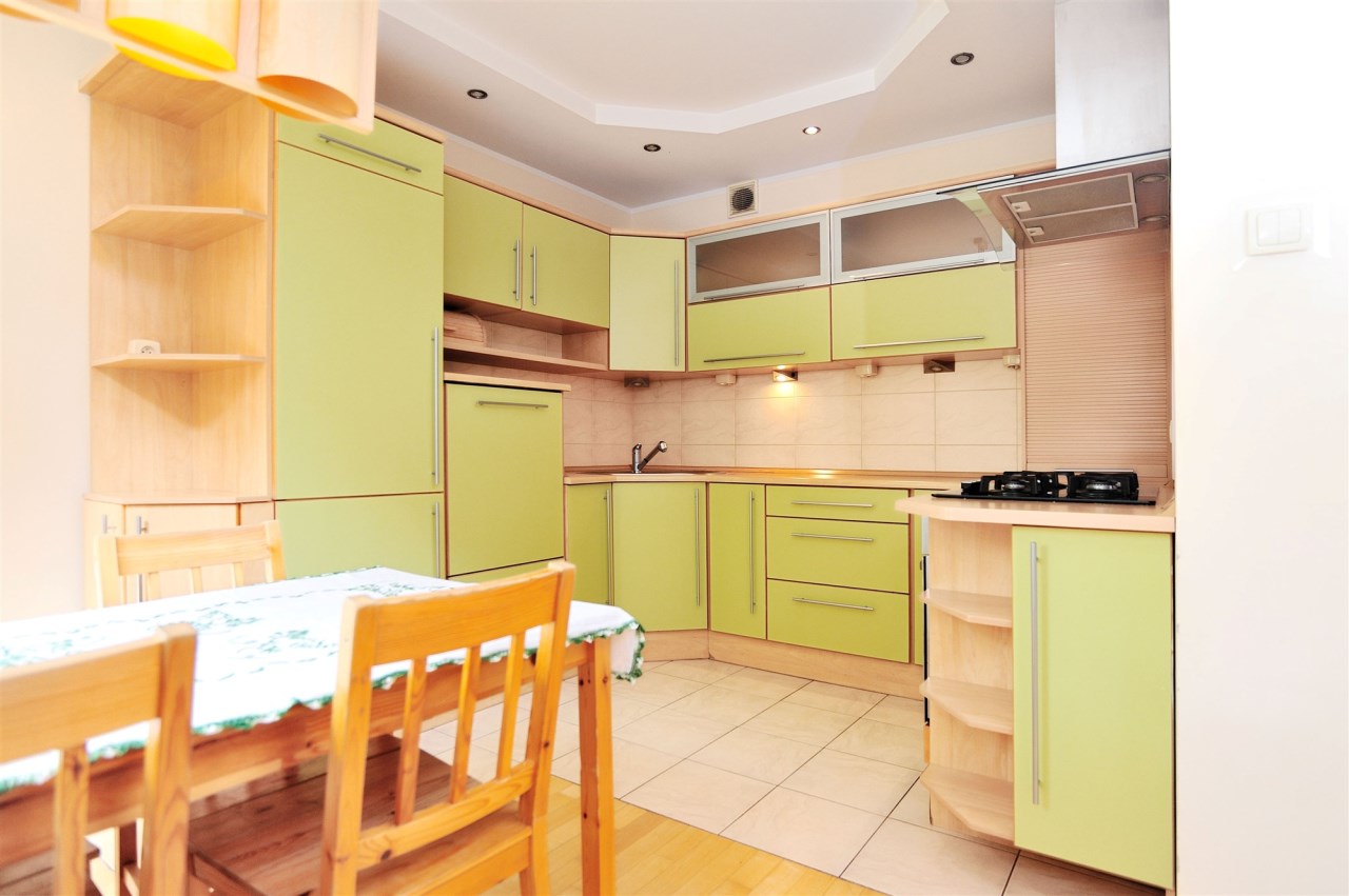 - Kuchnia (12m2) od strony południowej: Nowoczesne meble kuchenne w zabudowie w kolorze jesionowym i jasno zielonym. Duża lodówka z zamrażarką Electrolux w zabudowie, Zmywarka Siemens w zabudowie, kuchenka gazowa z płytą szklaną Whirlpool, piekarnik elektryczny Whirlpool. W kuchni duży stół na 6 osób.